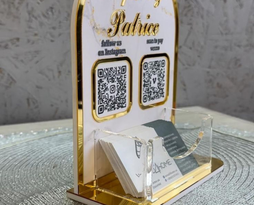 Dengan bentuk yang minimalis dan presisi, standing akrilik ini mudah ditempatkan di meja kasir, meja tamu, etalase toko, atau booth pameran. Produk ini tidak hanya mempercantik tampilan usaha Anda, tetapi juga memberikan kemudahan akses bagi pelanggan dalam melakukan transaksi atau mendapatkan informasi secara cepat.